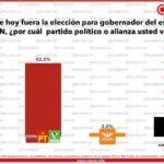 Para la entidad, a la pregunta “Si hoy fueran la elección a gobernador en Yucatán, ¿por cuál partido o alianza votaría?” El 44.3% escogió a Renán Barrera con las marcas PRI, PRI y PRD, mientras el 42.3% lo hizo por la marca Morena más PT y PVEM. Con el 2% está Movimiento Ciudadano, y hay un 11.3 por ciento de encuestados indecisos.