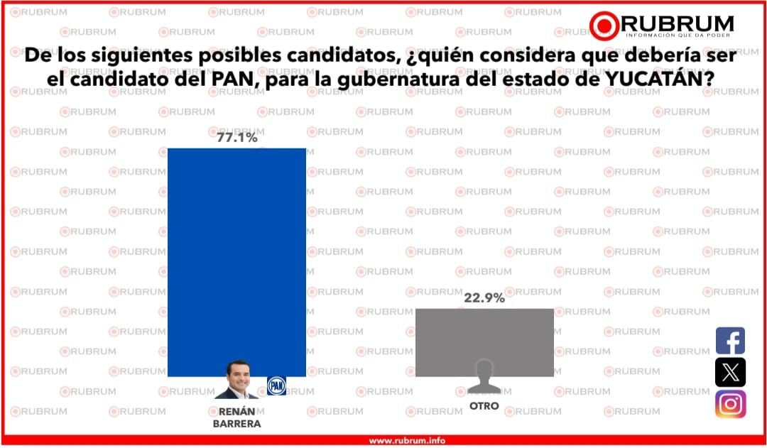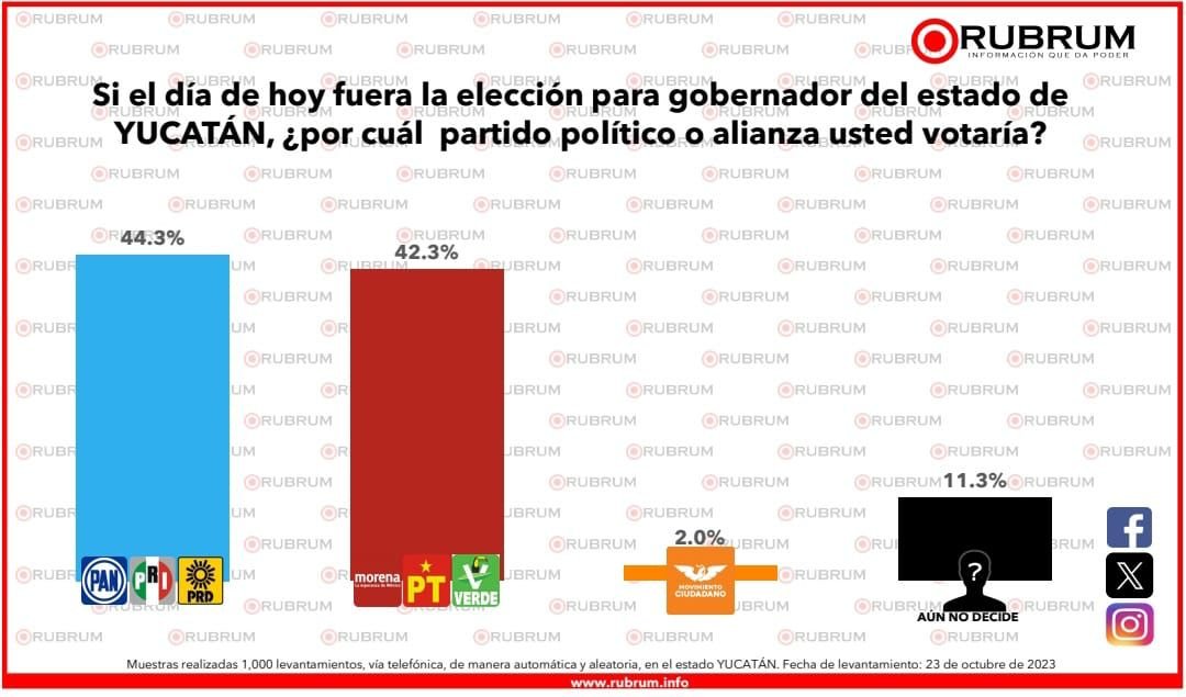 Para la entidad, a la pregunta “Si hoy fueran la elección a gobernador en Yucatán, ¿por cuál partido o alianza votaría?” El 44.3% escogió a Renán Barrera con las marcas PRI, PRI y PRD, mientras el 42.3% lo hizo por la marca Morena más PT y PVEM. Con el 2% está Movimiento Ciudadano, y hay un 11.3 por ciento de encuestados indecisos.
