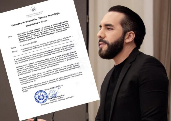 San Salvador, 2 de octubre de 2025. – El presidente Nayib Bukele anunció la prohibición del uso del lenguaje inclusivo en todos los centros educativos públicos de El Salvador, así como en materiales y dependencias oficiales de la Secretaría de Educación.