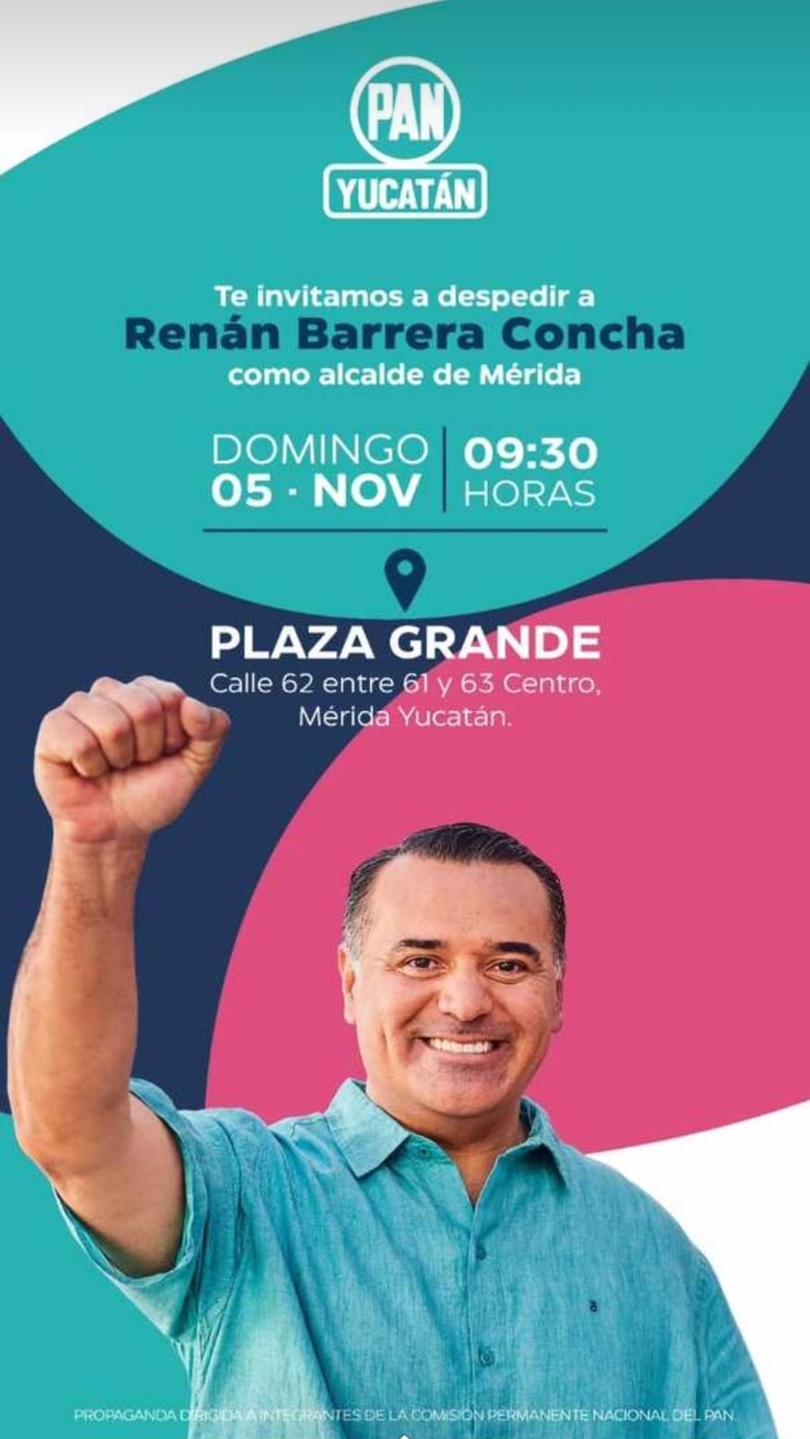 Este domingo 5, a las 09:30 de la mañana, la Plaza Grande de Mérida será el punto de reunión de militantes y simpatizantes del Partido Acción Nacional para la gran despedida a Renán Barrera como alcalde. Deja como presidente municipal interino al abogado Alejandro Iván Ruz Castro.