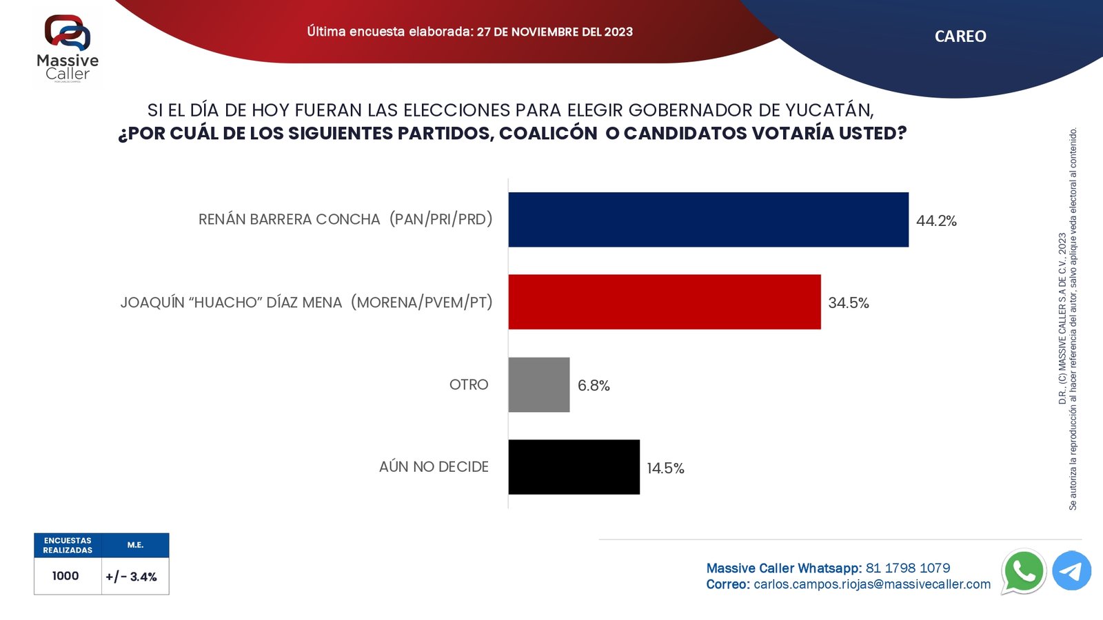 Una reciente encuesta realizada por Massive Caller ha revelado un incremento significativo en el margen de votantes que favorecerían a Renán Barrera Concha como el próximo Gobernador del estado de Yucatán. La encuesta planteó la pregunta crucial: “Si hoy fueran las elecciones para elegir gobernador, ¿por cuál de los siguientes partidos, coaliciones o candidatos votaría usted?”.